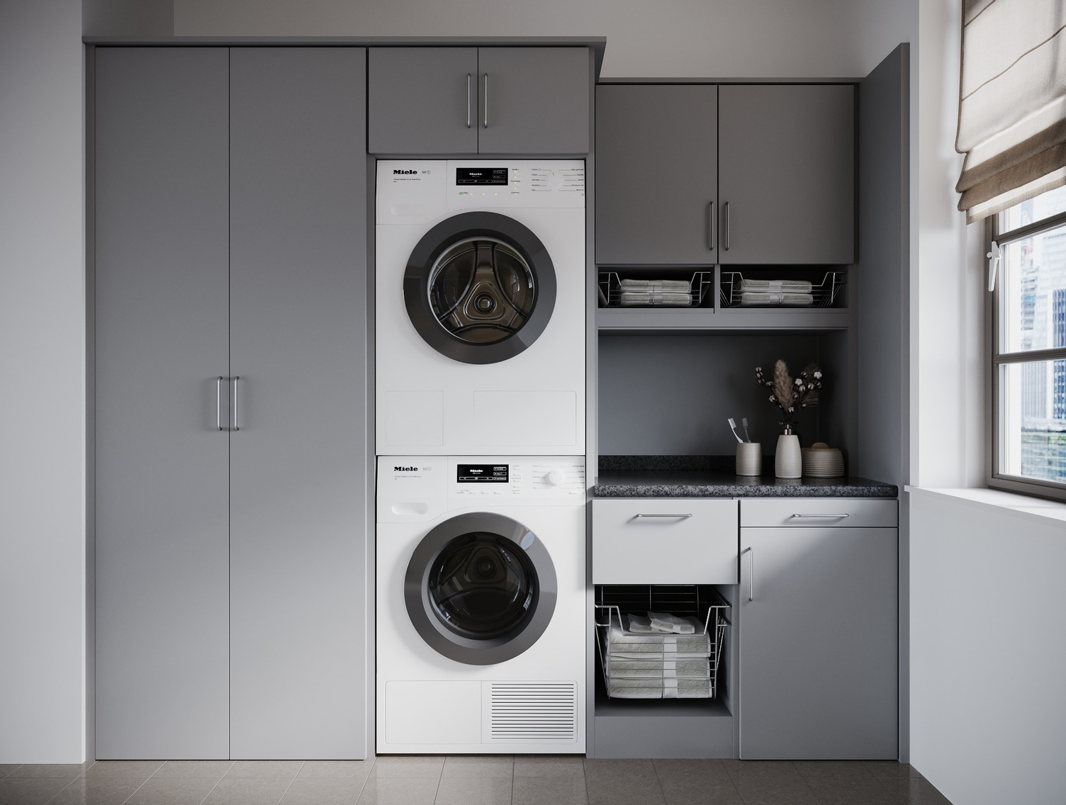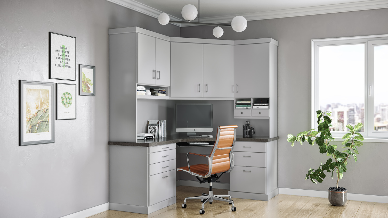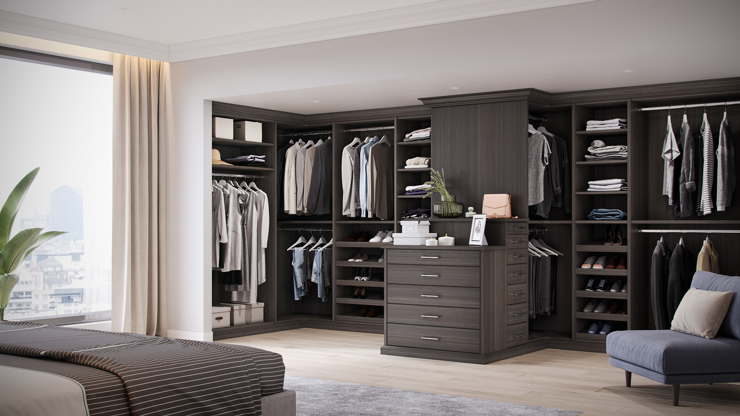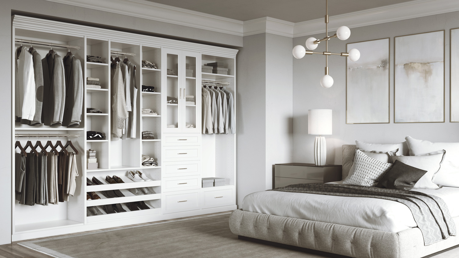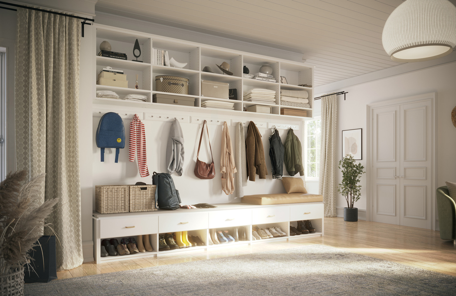 Legacy™ mudroom system featuring Deco doors with reeded glass inserts, Deco drawers, gold H9 4IN pulls, coat hooks, crown molding, and base molding.