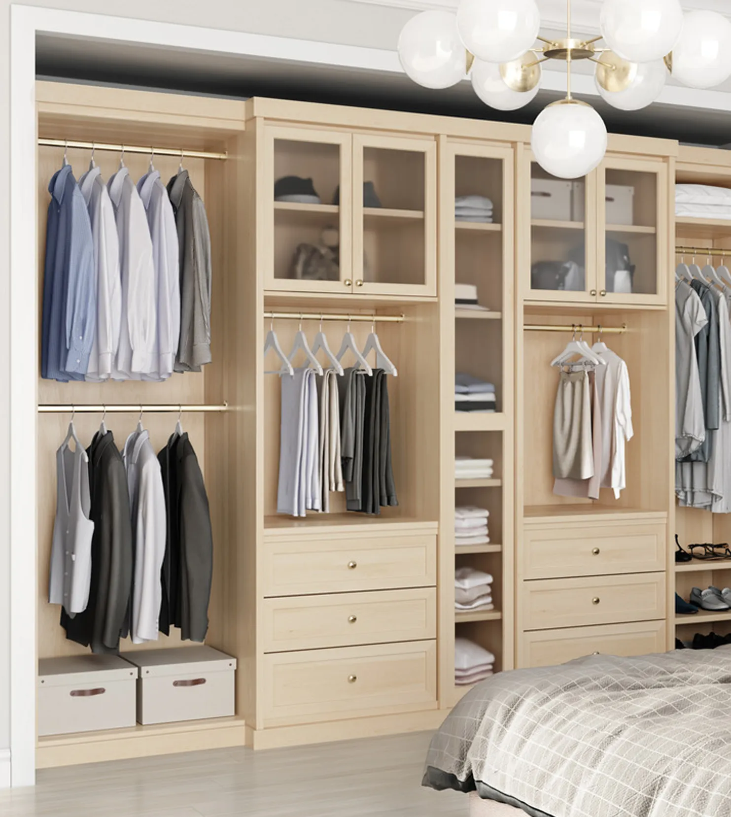 Closet World® closets are crafted from industrial-grade particle board, with MDF and plywood options available. For maintenance, regular light dusting suffices. For deeper cleaning, use gentle cleaners on melamine surfaces and soft cloths for metal parts. Avoid harsh chemicals to protect the materials. For Lucite doors, use a soft cloth and acrylic-friendly cleaners to prevent scratches. Velvet drawer inserts should be dusted with a lint brush or vacuumed gently to avoid moisture and damage.