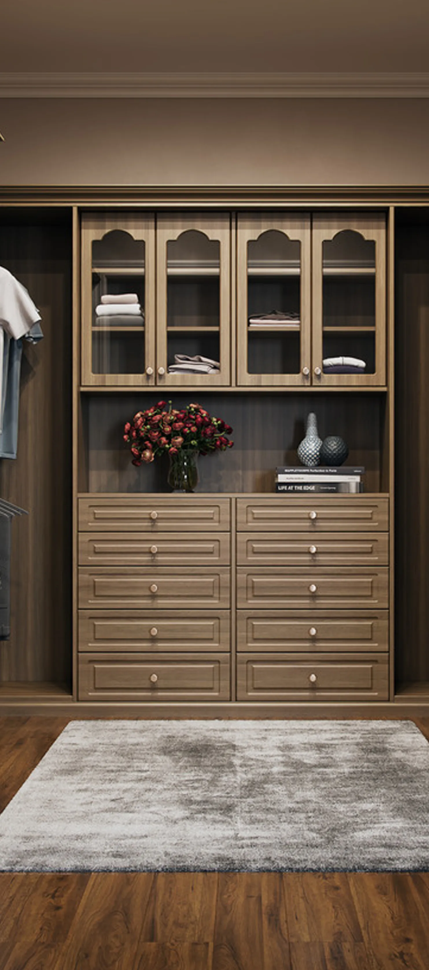 Closet World® offers a vast array of drawer styles, with over 10 styles and 5 face options, including glass display and pull-out drawers, among others. Your design consultant will help you explore the options to find the perfect fit for your needs. For more information, visit our website.