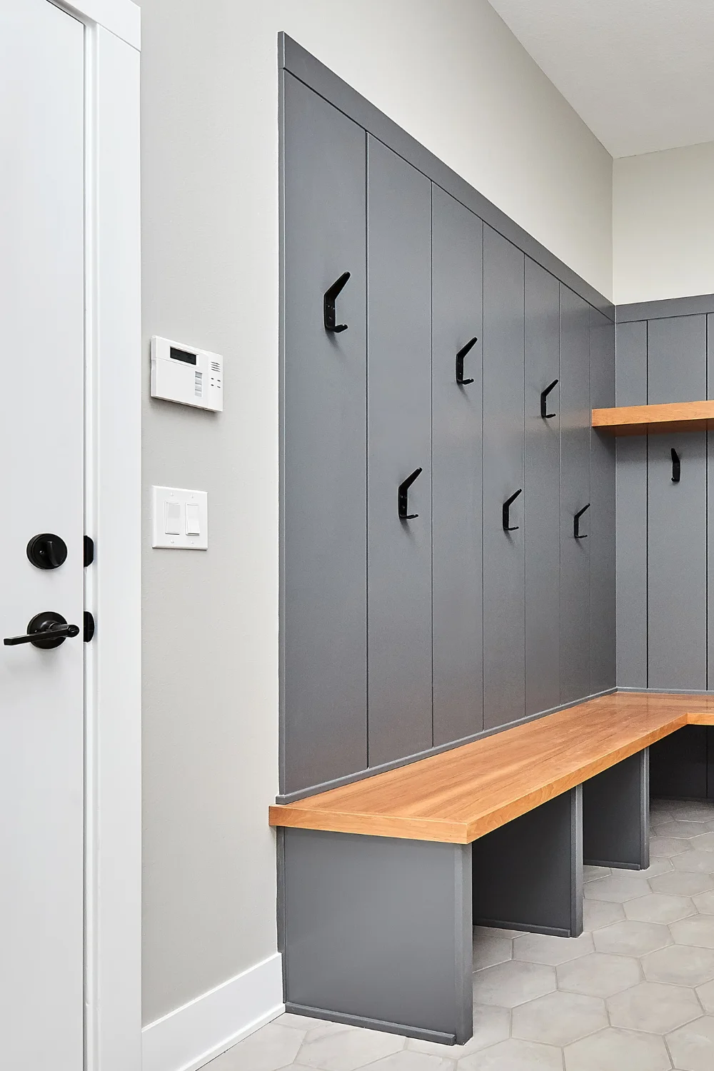 Consejo profesional: Instale ganchos y estantes a diferentes alturas para acomodar a todos los miembros de la familia. Los ganchos inferiores son perfectos para que los niños alcancen sus abrigos, mientras que los ganchos más altos se pueden usar para prendas de abrigo para adultos.