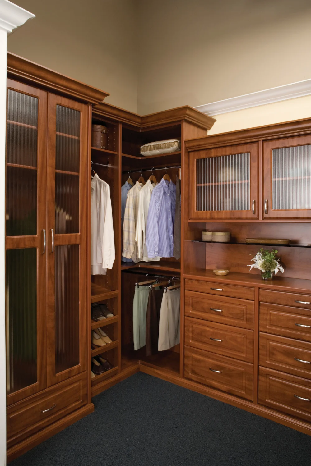 Para armarios más grandes, las posibilidades de los sistemas de almacenamiento con cajones son infinitas. Podrías crear un lujoso vestidor con secciones separadas para diferentes tipos de ropa, zapatos y accesorios. O bien, si tu armario está escondido en una esquina, considera una unidad de esquina que aproveche al máximo el espacio disponible.