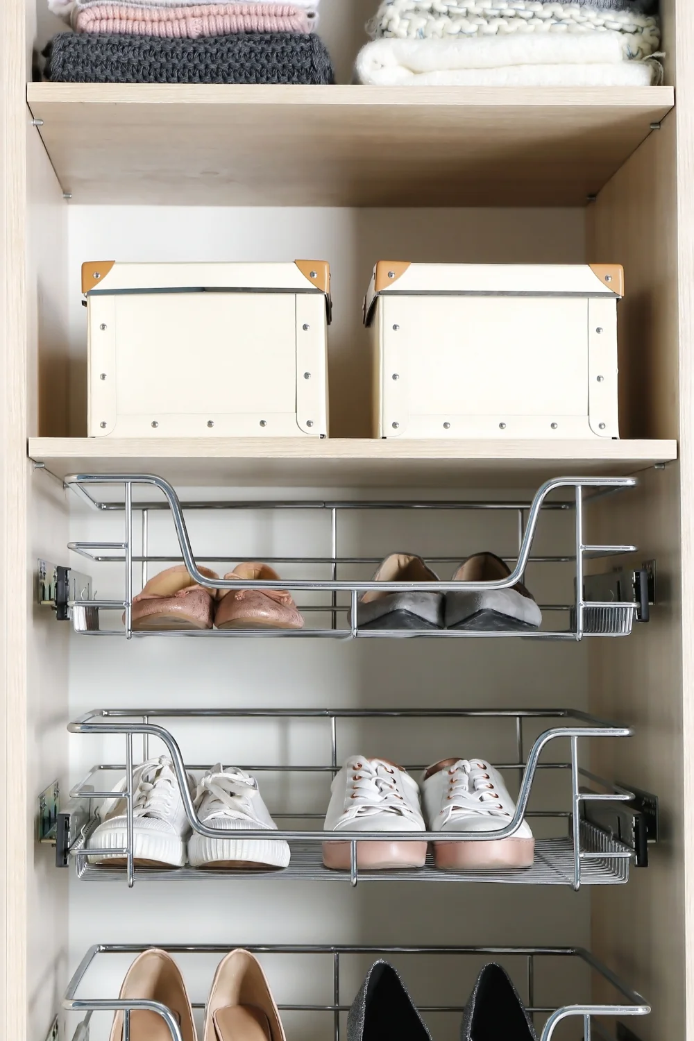 Los compartimentos para zapatos elevan los zapatos del suelo, lo que hace que sean fáciles de ver y agarrar sin tener que retorcerte hasta convertirlos en un pretzel. Con un cubículo para zapatos, puedes ponerte sin esfuerzo tu par favorito y salir por la puerta sin sudar ni un ápice.
