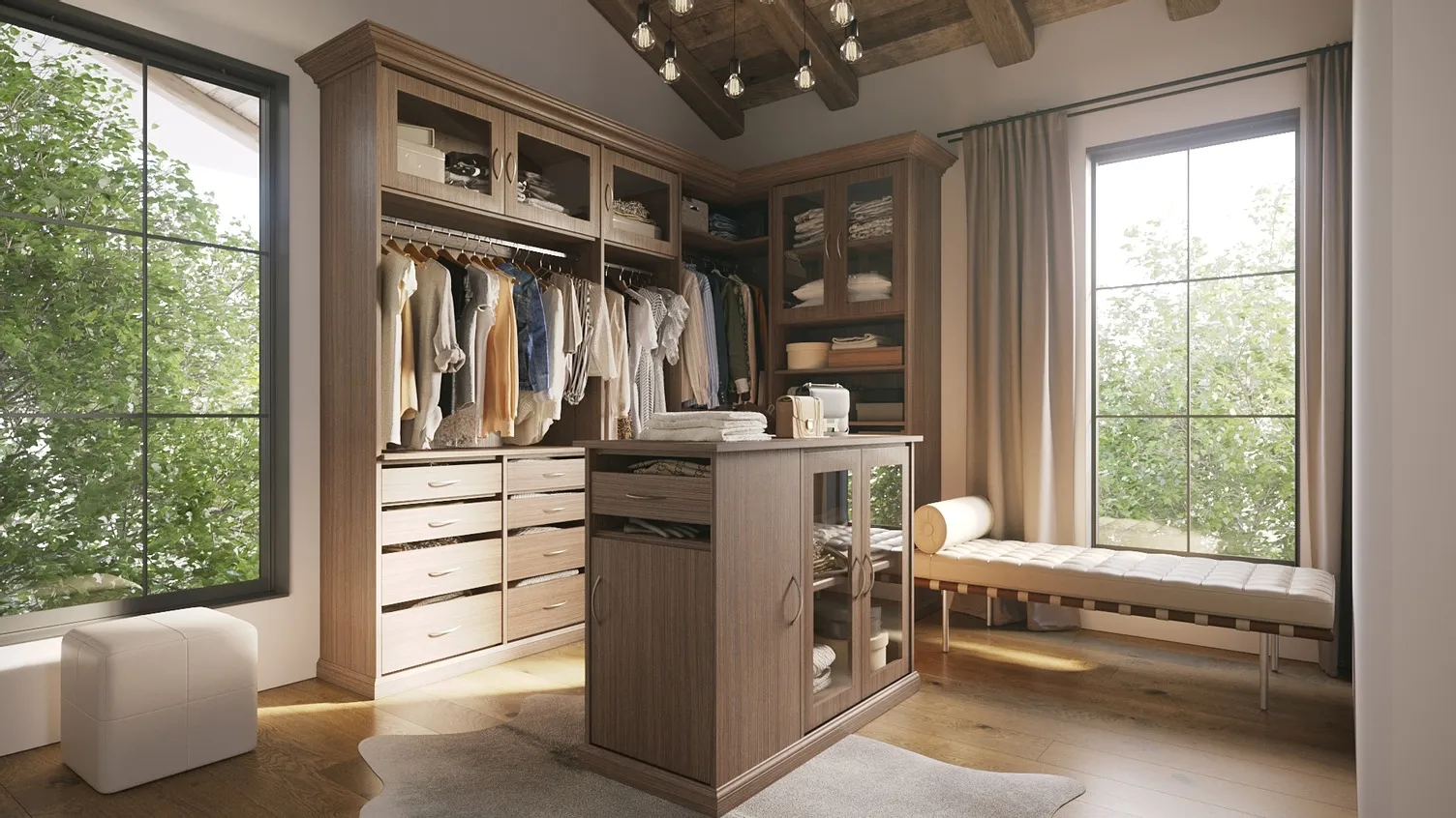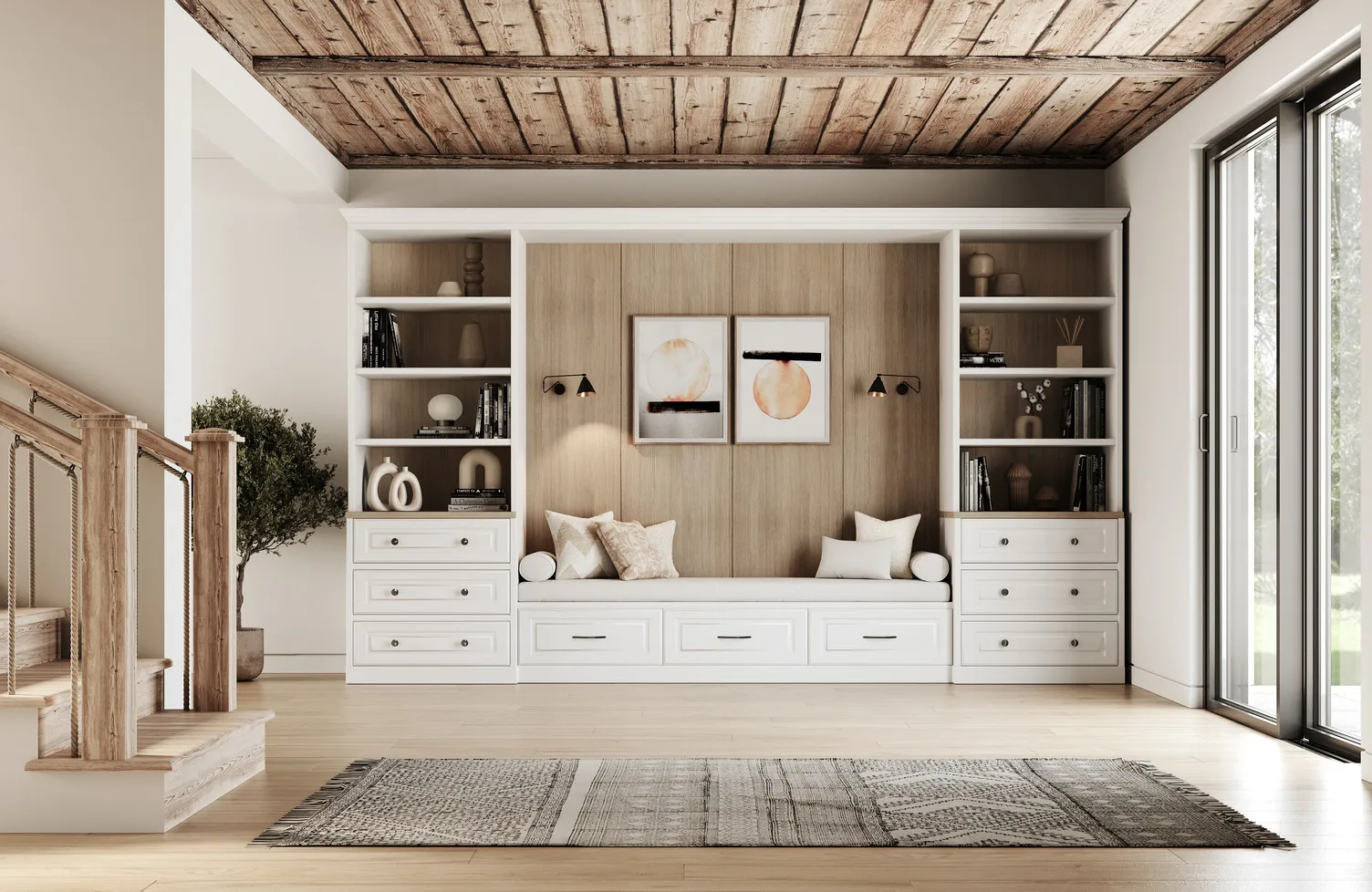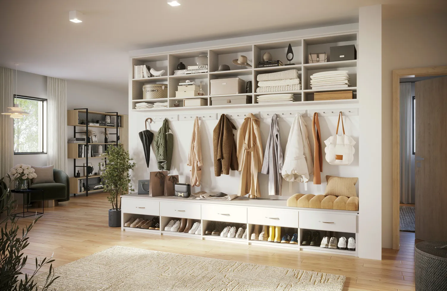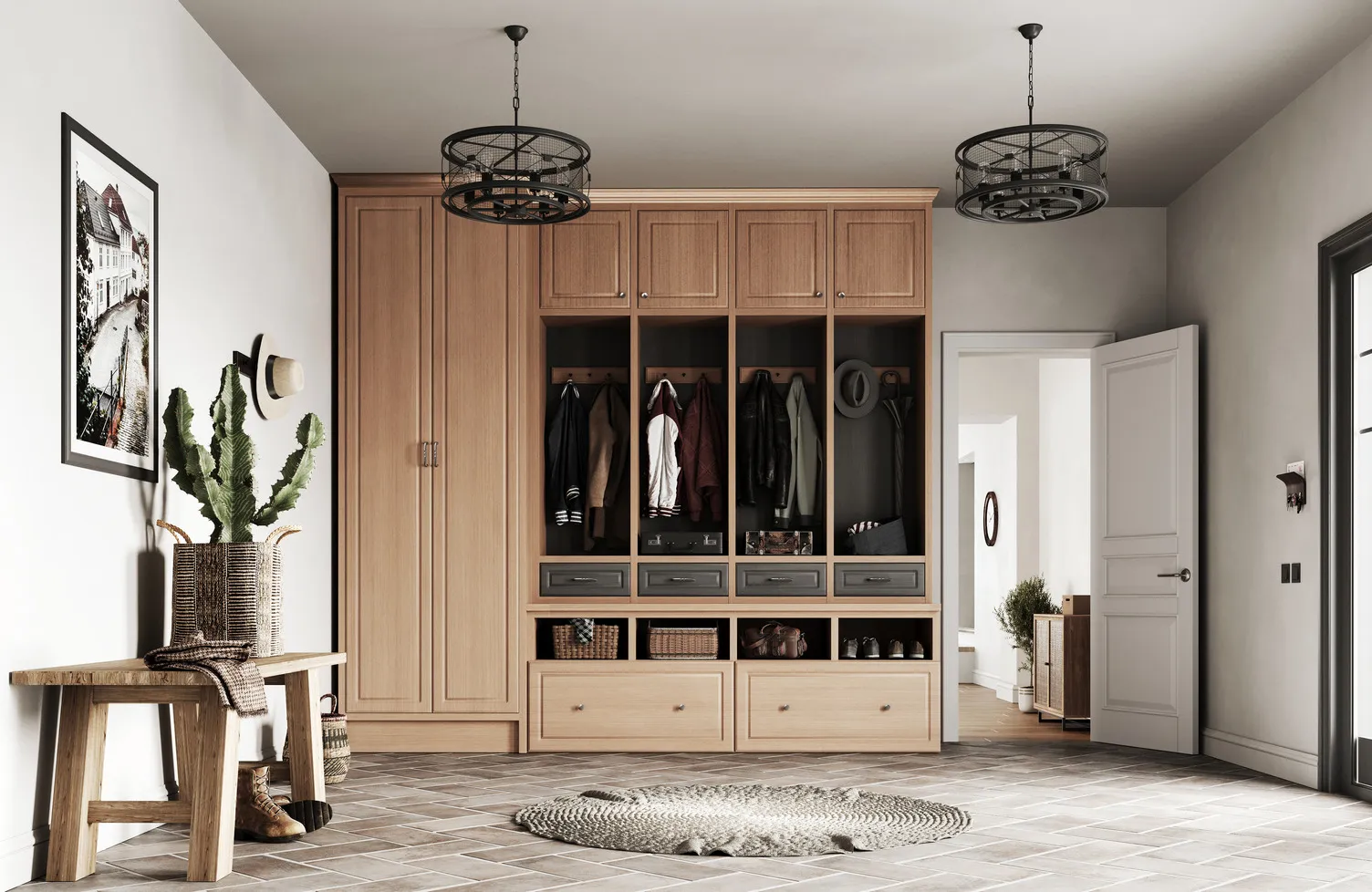 Legacy™ mudroom system featuring Deco doors with reeded glass inserts, Deco drawers, gold H9 4IN pulls, coat hooks, crown molding, and base molding.