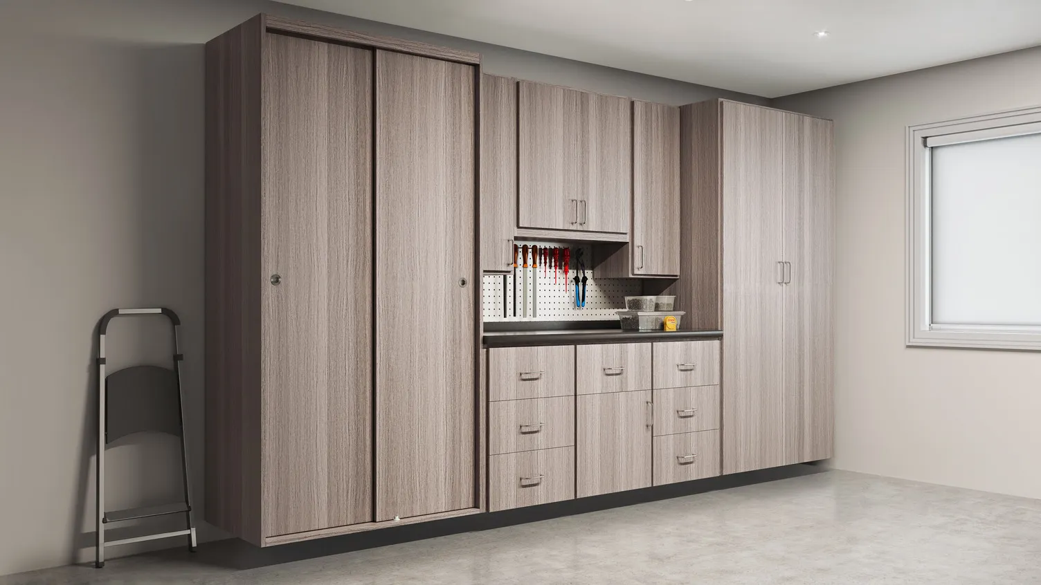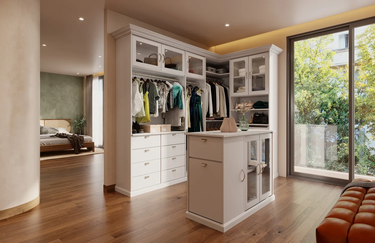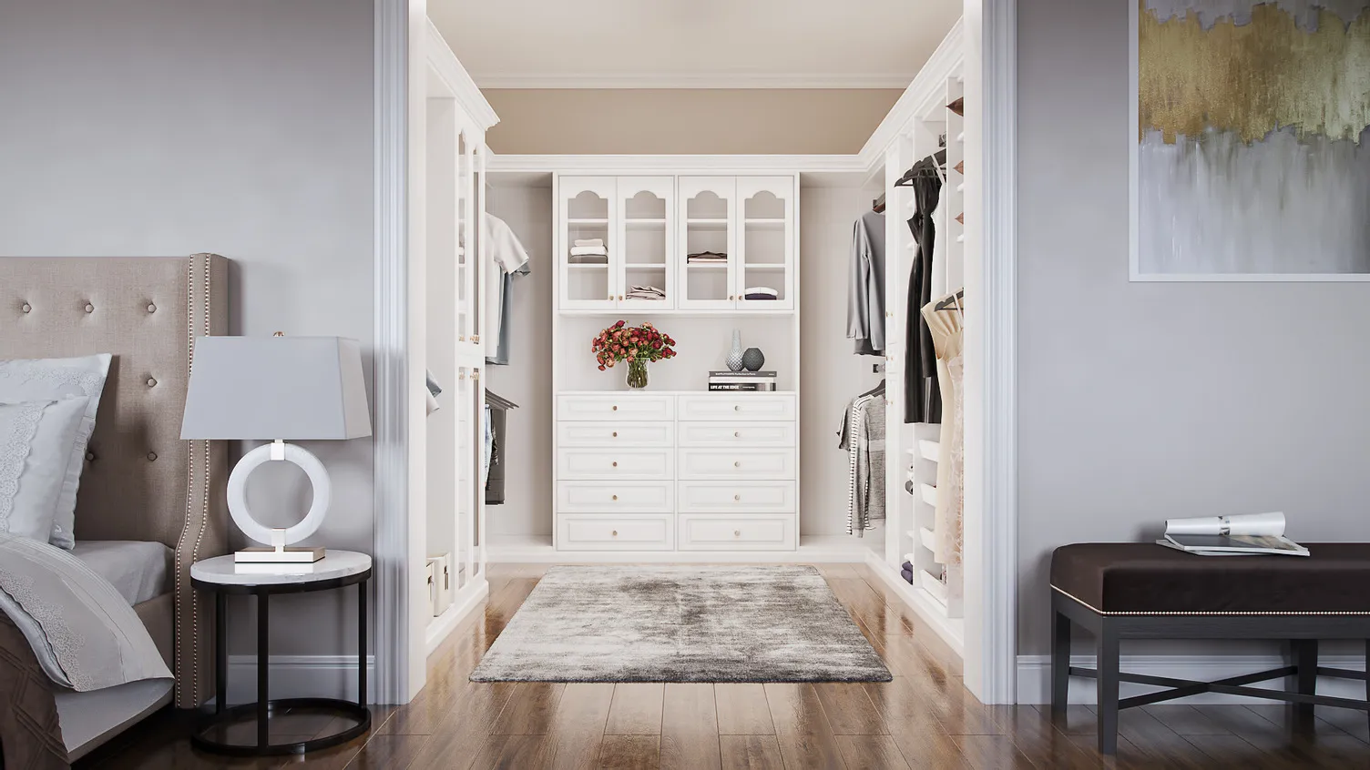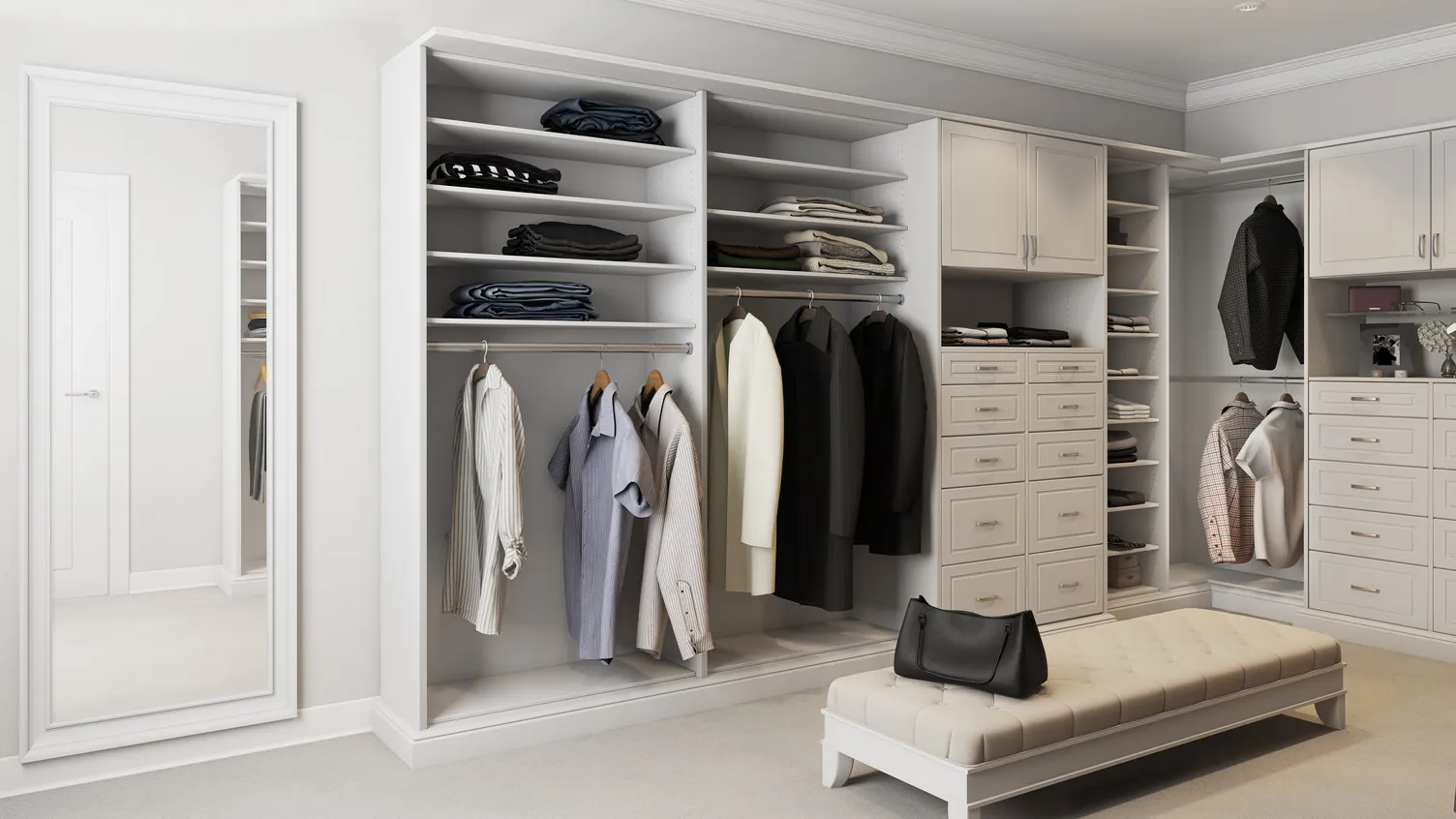 Legacy™ mudroom system featuring Deco doors with reeded glass inserts, Deco drawers, gold H9 4IN pulls, coat hooks, crown molding, and base molding.