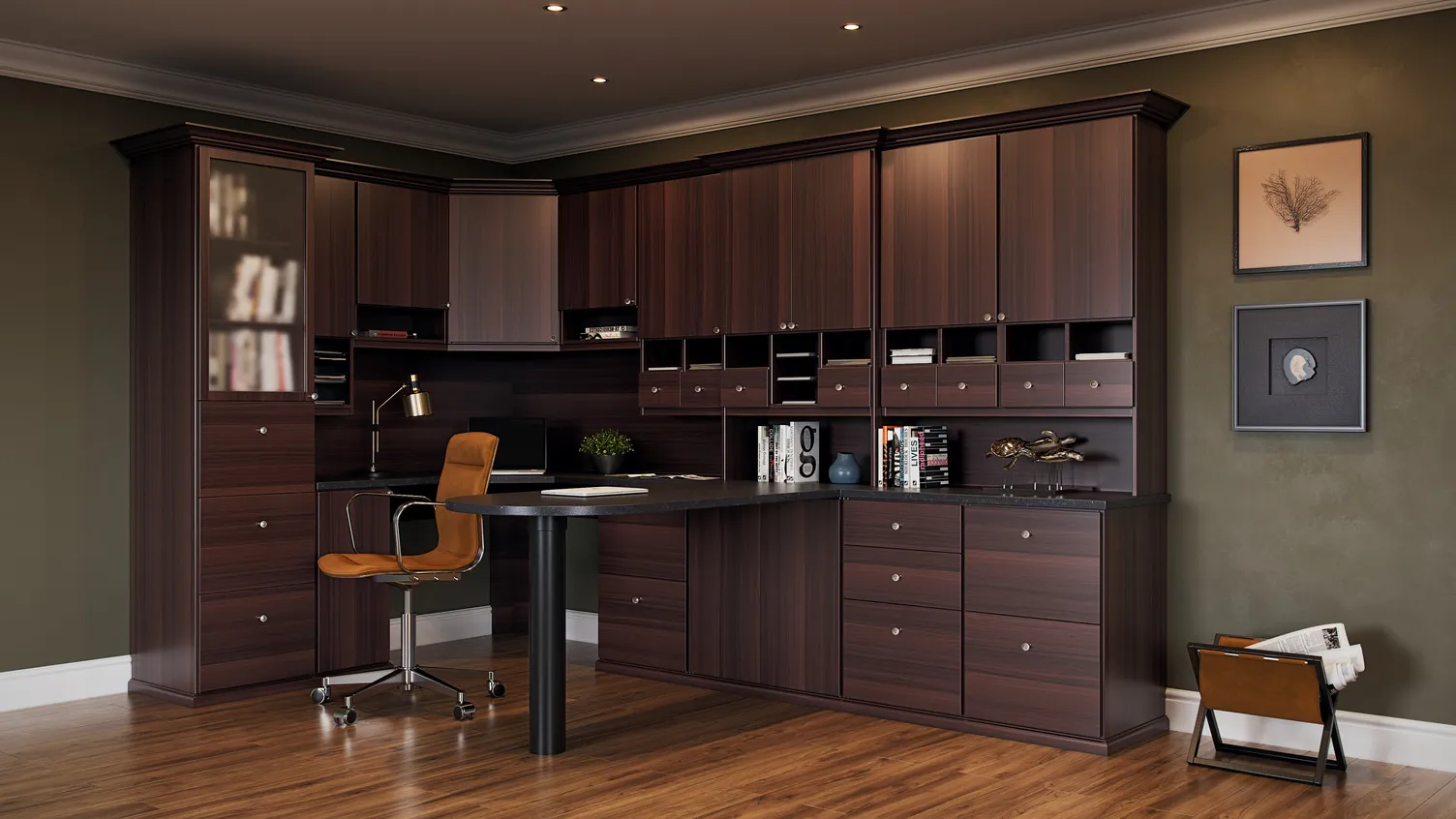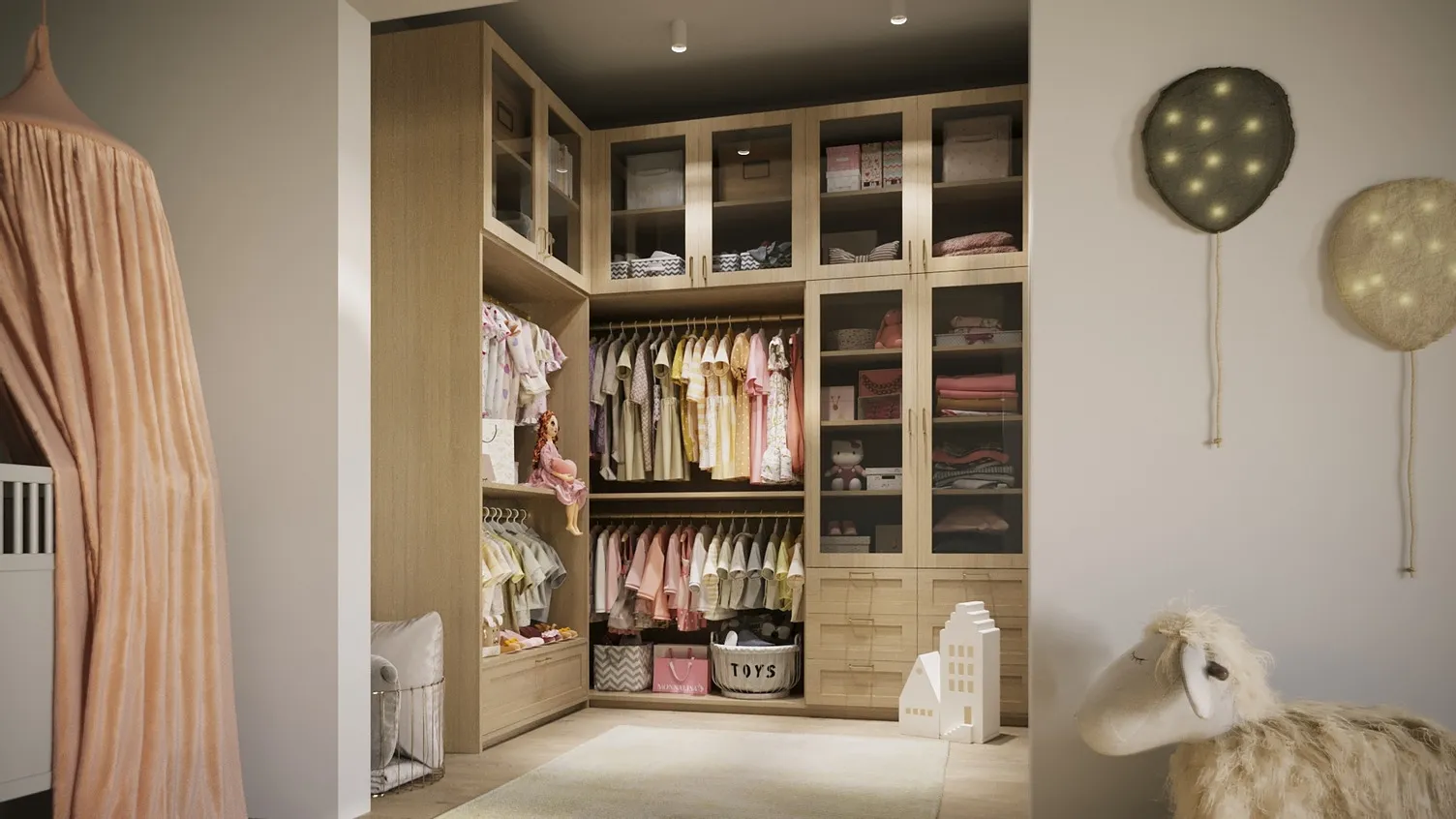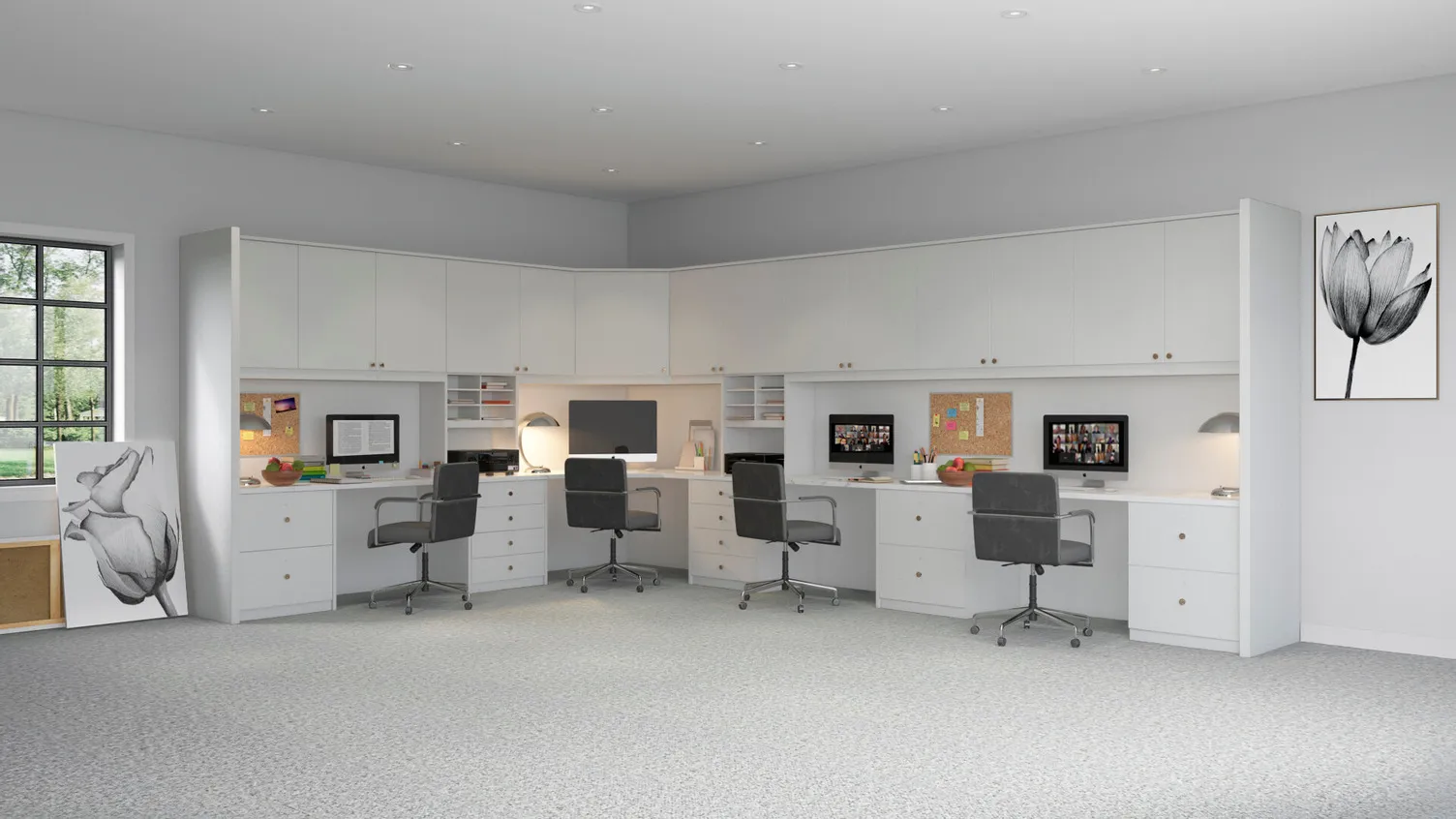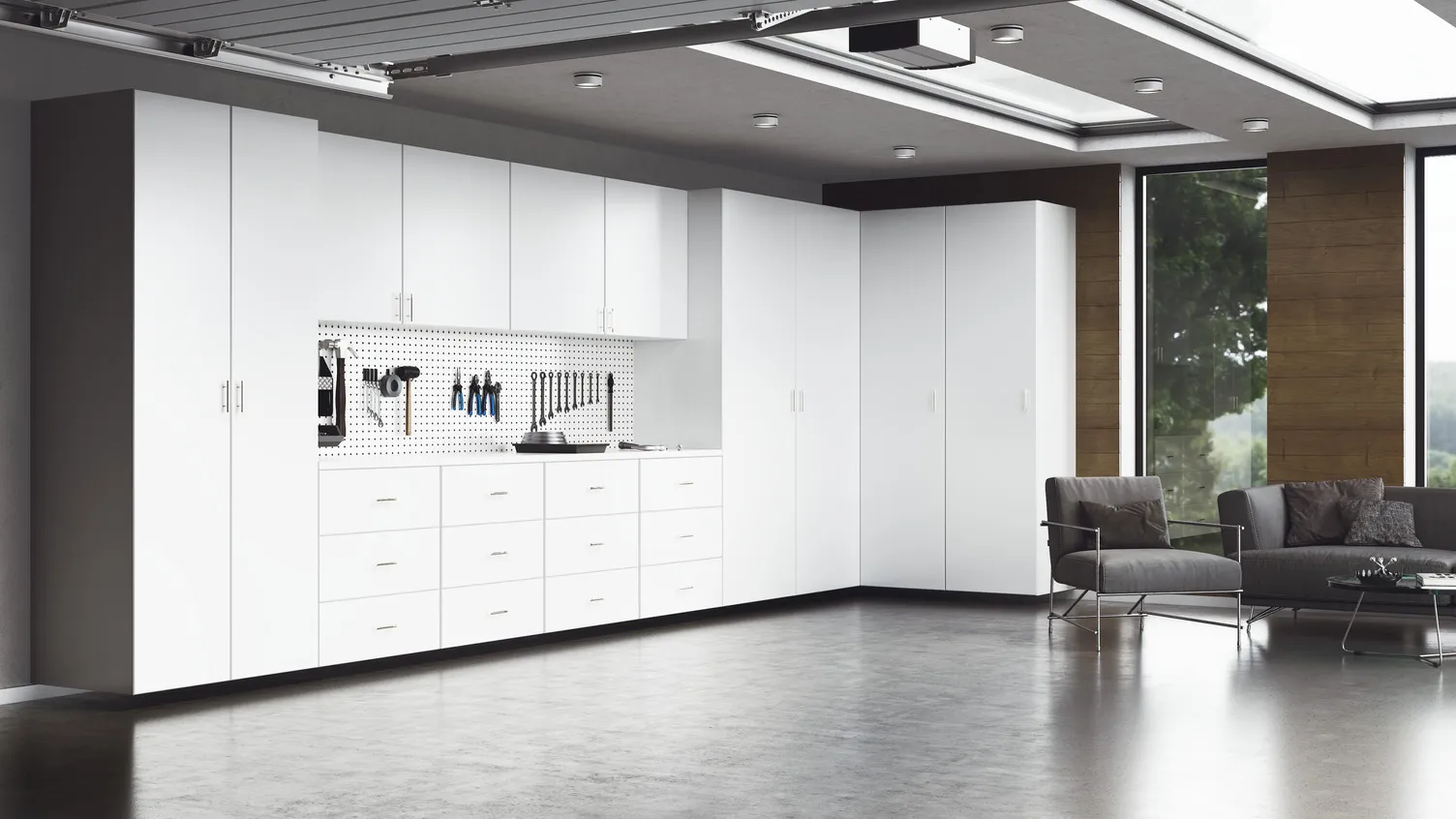 Legacy™ mudroom system featuring Deco doors with reeded glass inserts, Deco drawers, gold H9 4IN pulls, coat hooks, crown molding, and base molding.