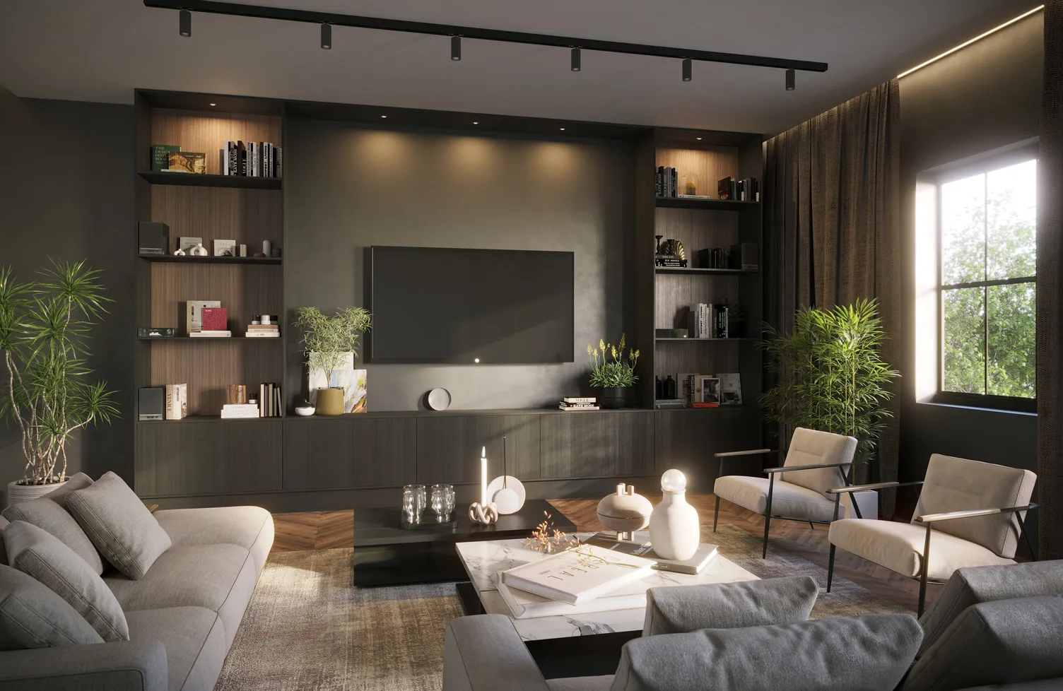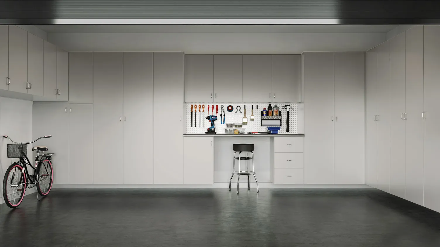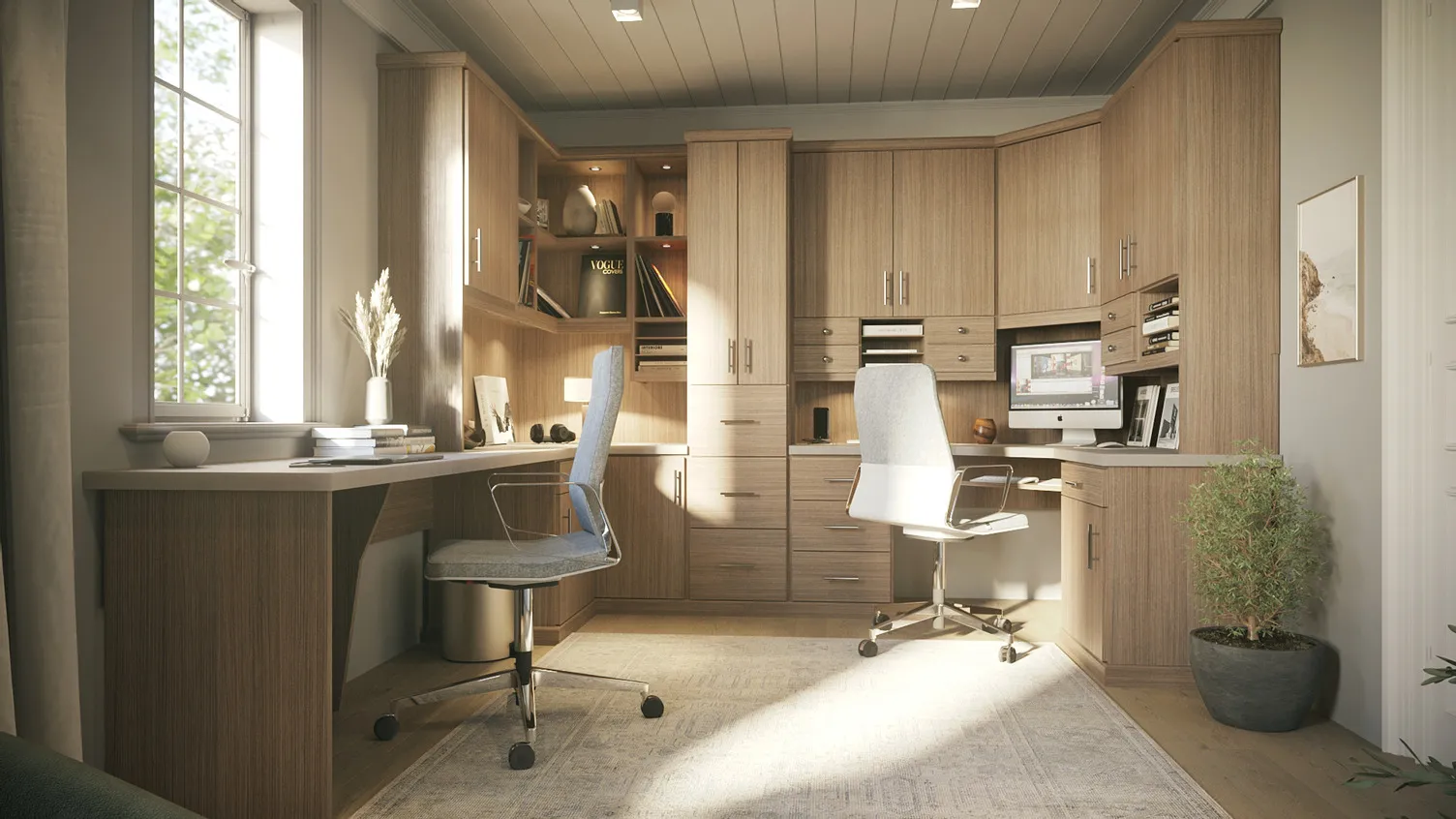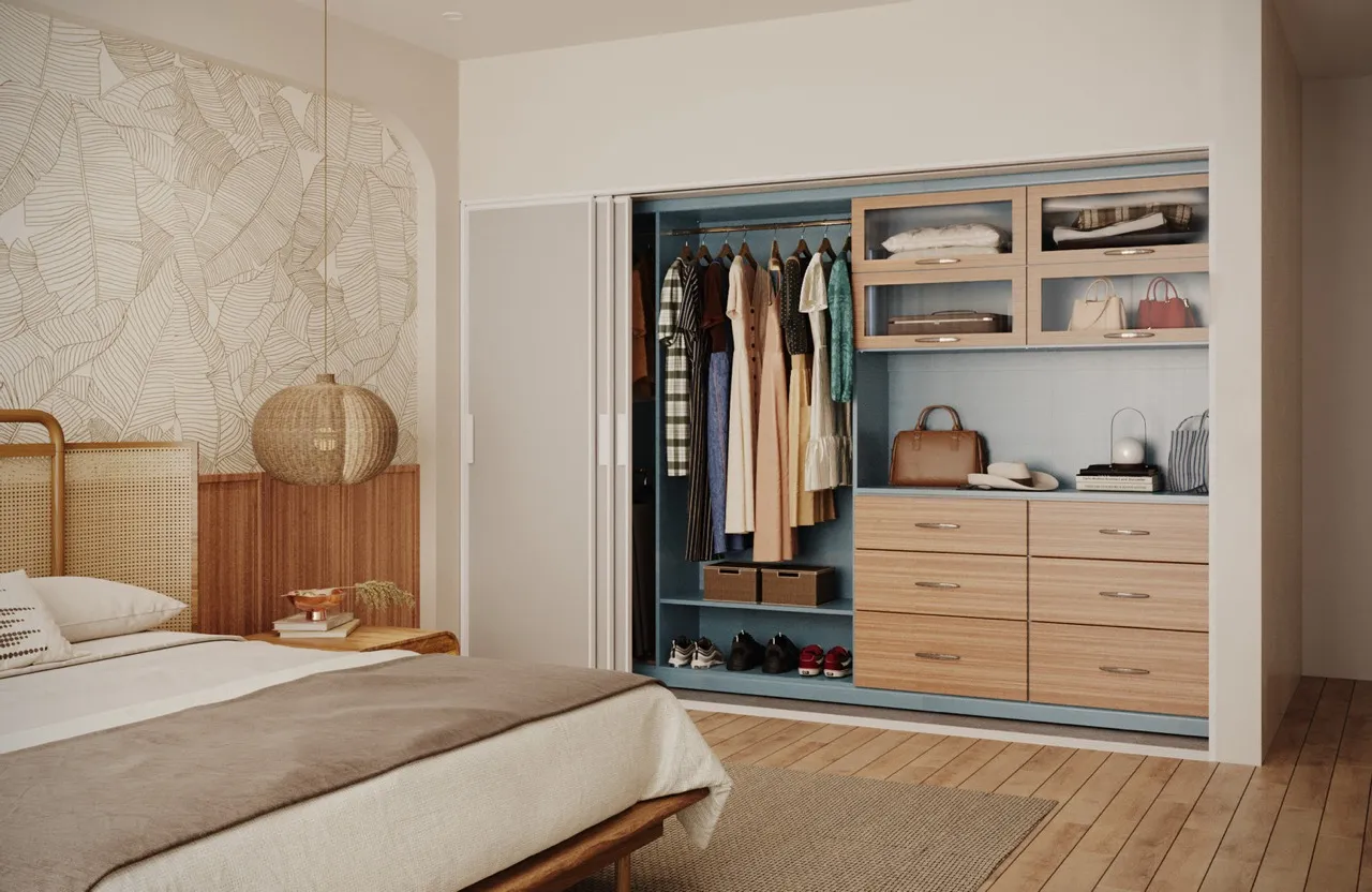 Legacy™ mudroom system featuring Deco doors with reeded glass inserts, Deco drawers, gold H9 4IN pulls, coat hooks, crown molding, and base molding.