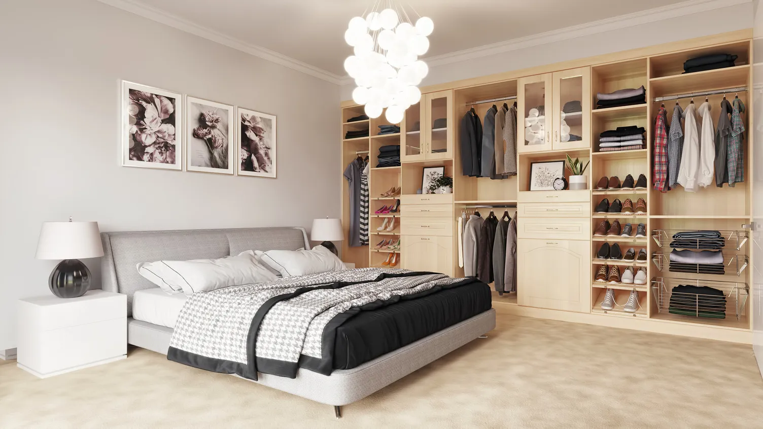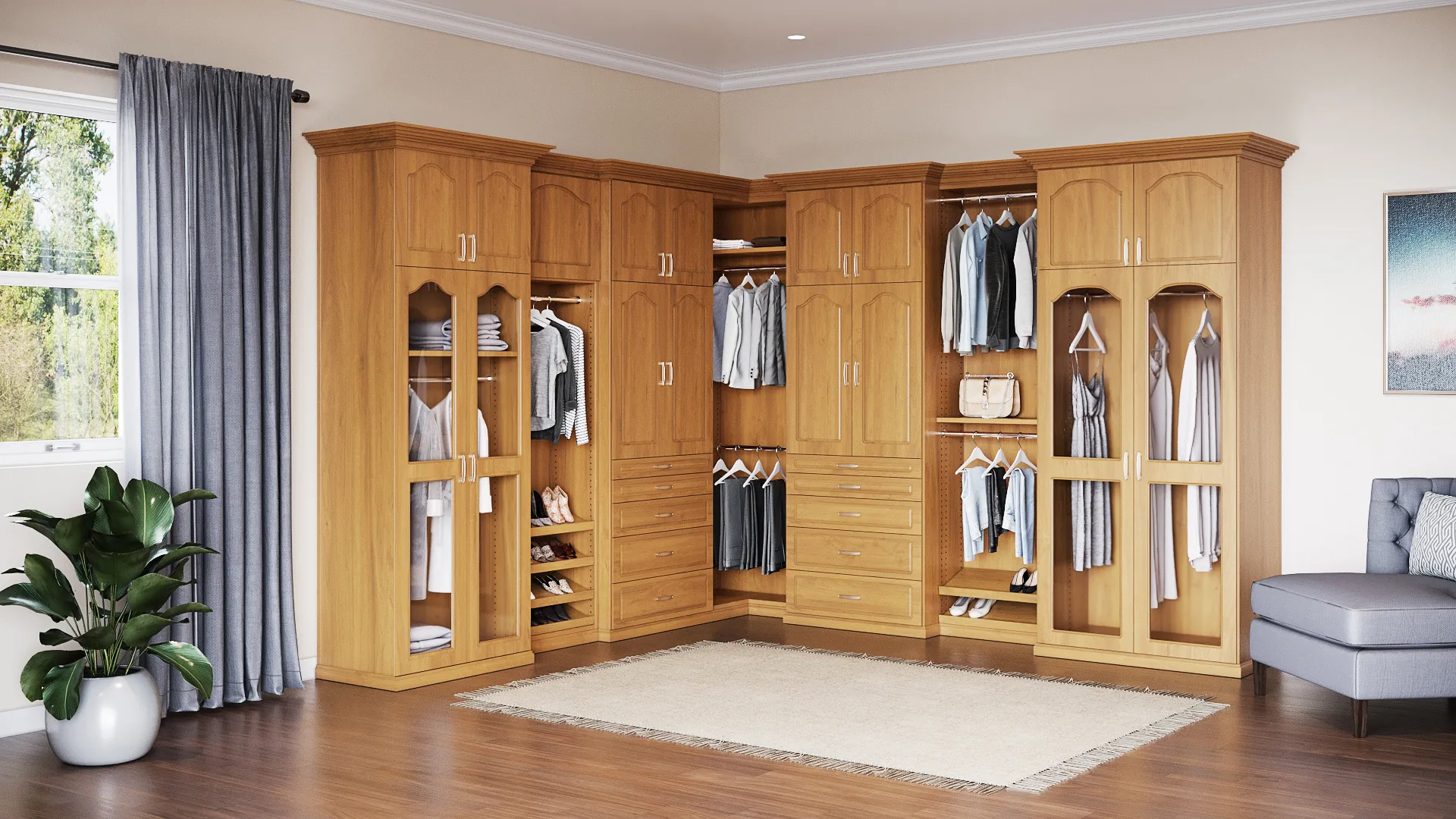HONEY MAPLE WOODGRAIN FINISH | DECO 101 DOORS, G101 GLASS DOORS, 101 DRAWERS, 424 CRL CROWN & 426 BASE MOLDING | H9 4IN GOLD PULLS