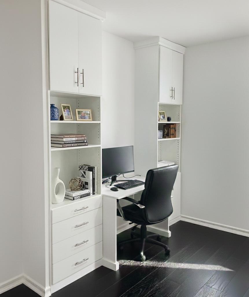A custom home office can include a built-in desk, upper and lower cabinets, drawers, filing storage, shelving, display areas, work surfaces, and other organization features. Closet World can design the layout around the way you use the room, whether you need everyday office storage, a cleaner desktop, or a more flexible multi-purpose setup.