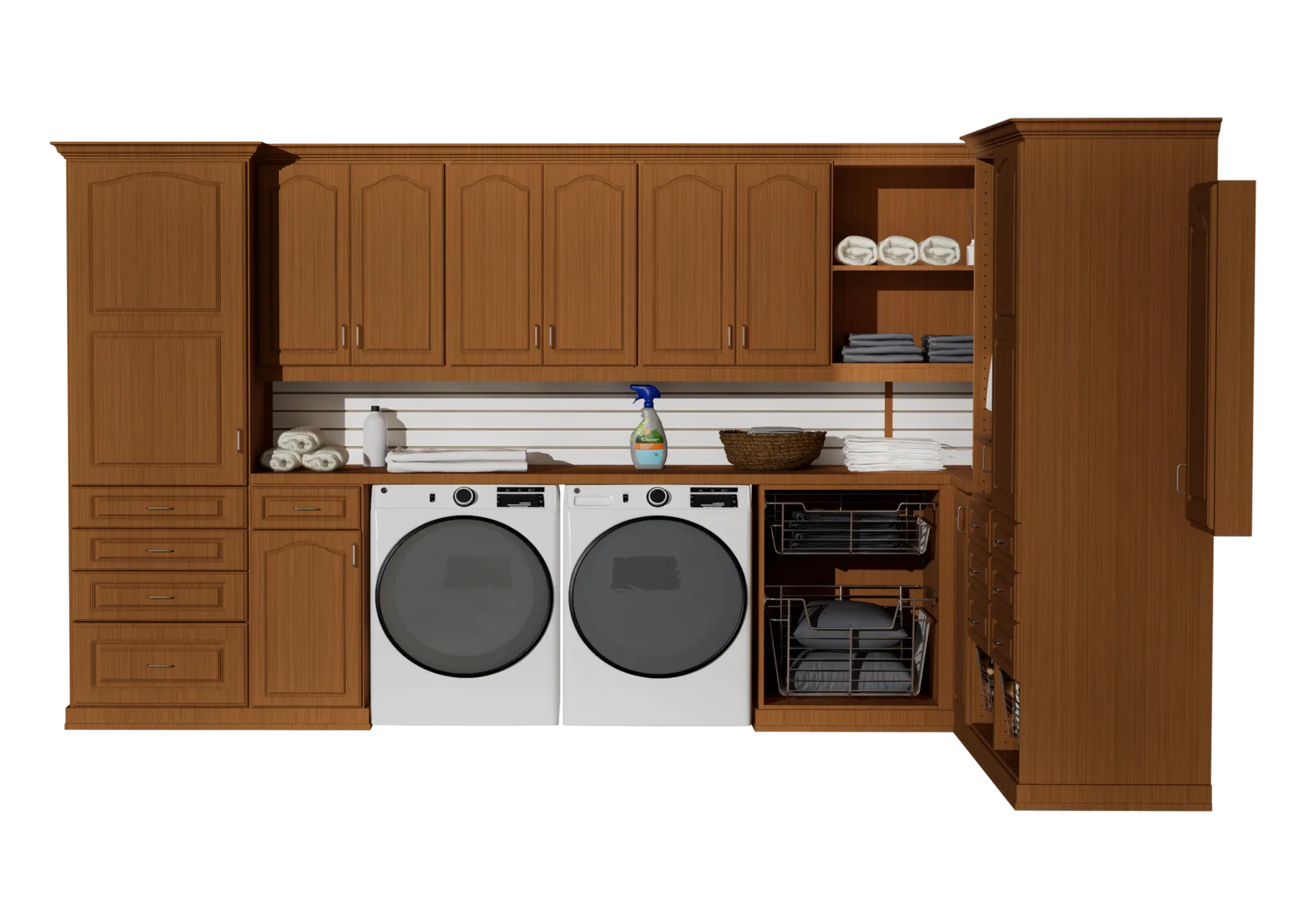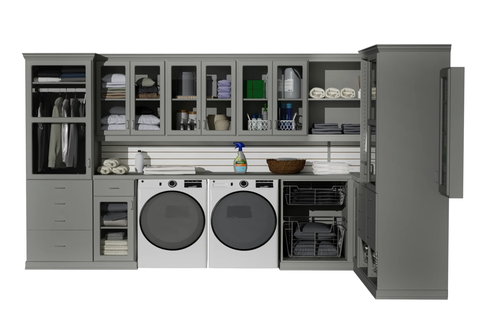 Choose your Laundry Room collection. From custom laundry cabinets to complete laundry room storage systems, you'll select the setup that fits your home and your lifestyle. Add shelving, cabinetry, and built-in organization that keep detergents, linens, and supplies right where you need them.